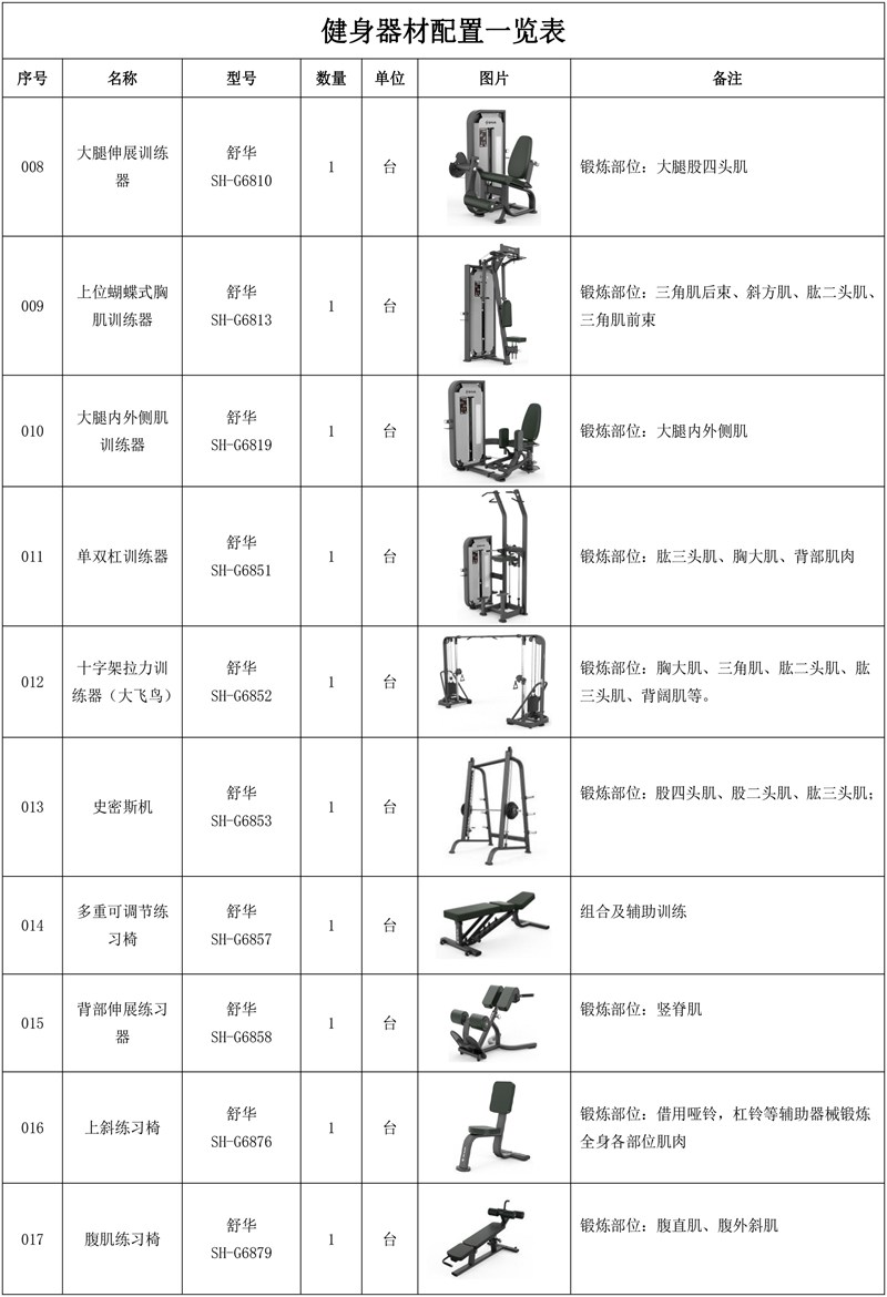 13.333史密斯机SH-G6853*1台-锻炼股四头肌、股二头肌、肱三头肌;史密斯机采用固定轨迹的杠铃设计,大大降低了训练过程中的安全风险,通过深蹲、卧推、肩推等经典动作,可以针对性地锻炼腿部力量、上肢力量、背部肌群、胸部塑形以及肩部稳定等,从而全面提升身体素质,满足不同的健身需求;