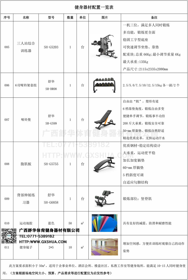 此方案要求面积小于50m²,适用于企事业单位、酒店会所、楼盘社区、私教工作室等健身场所,能满足10-15人同时健身使用(方案根据场地空间大小、预算、产品需求等进行配置仅为启发性参考)
