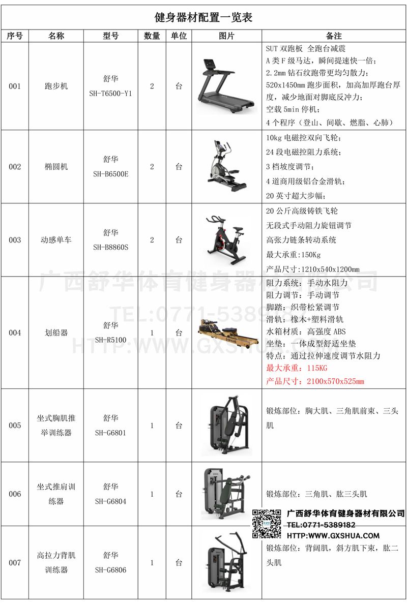 有氧器材区域配置333跑步机2台,椭圆机2台,动感单车2台,划船器1台,有效提升心肺功能;力量器械配置推胸、推肩、背肌、腿部等训练器,可以锻炼多个部位的肌肉,满足使用者全身锻炼的需求;自由力量区域配置哑铃套组、腹肌板等满足多样化训练需求。