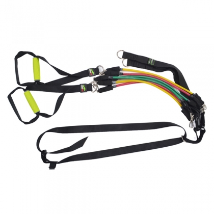 材质:硅胶把手,4组不同级别拉力训练绳,尼龙织带