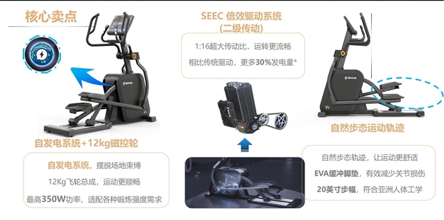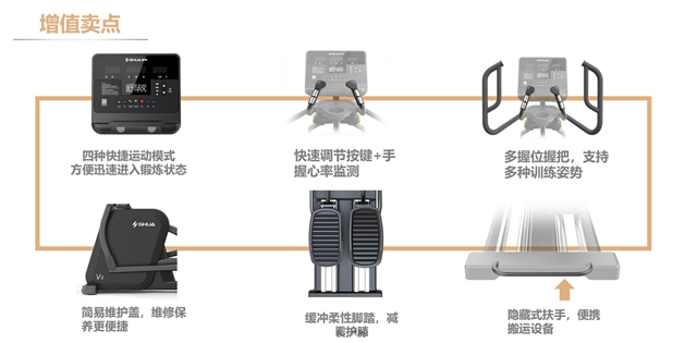 安全稳重,细节制胜。333V8椭圆机是一款高安全系数的椭圆机,整体设计遵循人体工学科学,缓震踏板中添加减震层设计,能够有效减少运动冲击带来的关节损伤,且最大支持160kg载重,满足更多人群。手握心率监测、多功能置物架、自发电系统取代统电源......在细节上,新款椭圆机站在健身者角度,添加了不少设计者的巧思,为健身者带来更贴心的体验。