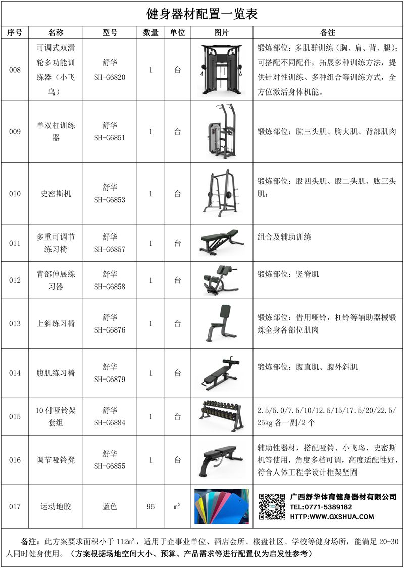 此方案要求面积小于112m²,适用于企事业单位、酒店会所、楼盘社区、学校、商用健身房等健身场所,能满足20-30人同时健身使用。(方案根据场地空间大小、预算、产品需求等进行配置仅为启发性参考)